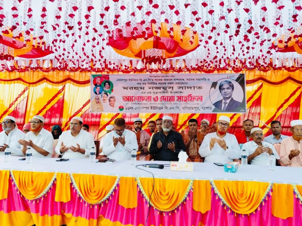 মনিরামপুর (যশোর) প্রতিনিধি ঃ যশোরের মনিরামপুর উপজেলার নেহালপুর ইউনিয়ন বিএনপির সাবেক সভাপতি ও ইউপি চেয়ারম্যান মরহুম নাজমুস সাদাতের ৩য় মৃত্যুবার্ষিকী উপলক্ষ্যে আলোচনা সভা ও দোয়া মাহফিল অনুষ্ঠিত হয়েছে।