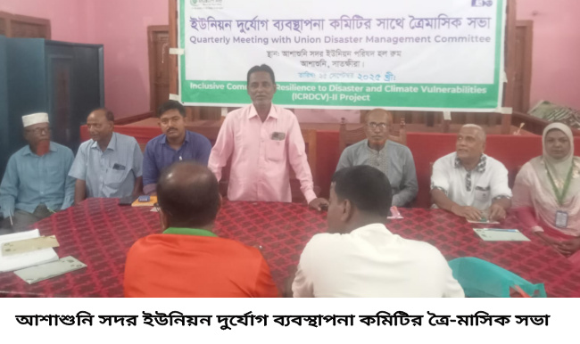 জি এম মুজিবুর রহমান, আশাশুনি (সাতক্ষীরা)।। আশাশুনি সদর ইউনিয়ন পরিষদ হলরুমে ইউনিয়ন দুর্যোগ ব্যবস্থাপনা কমিটির ত্রৈ-মাসিক সভা অনুষ্ঠিত হয়েছে। বৃহস্পতিবার (২৫ সেপ্টেম্বর) বেলা ১১ টায় এ সভা অনুষ্ঠিত হয়।