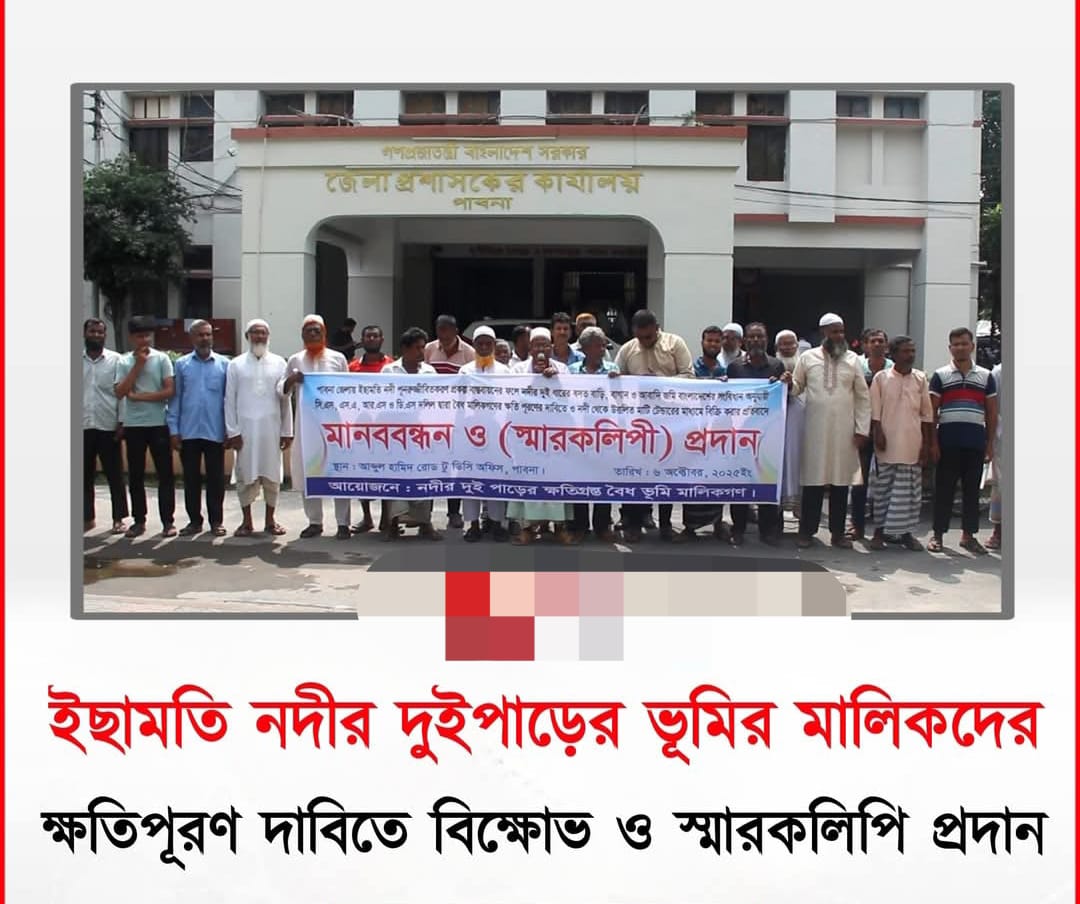 বিষেশ প্রতিনিধি।।৷ পাবনায় ইছামতি নদী খননের মাটি নদীর দুইপাড়ের ব্যক্তি মালিকানাধীন ফসলী জমি ও বসতবাড়ি পাশে রাখায় ফসলী জমিসহ বসতবাড়ি ক্ষতিগ্রস্ত ভূমির মালিকেরা ক্ষতিপূরণ চেয়ে বিক্ষোভ মানববন্ধন ও স্মারকলিপি প্রদান করেছেন গয়েশপুর ও একদন্ত ইউনিয়নের নদীর দুই পাড়ের ক্ষতিগ্রস্ত ভূমির মালিকেরা।