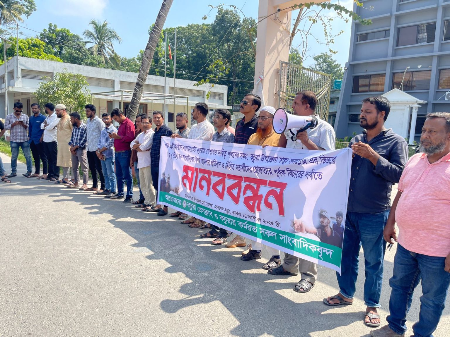 মঙ্গলবার সকাল ১০ টায় কচুয়া উপজেলা পরিষদের গেট সংলগ্ন প্রেসক্লাব চত্বরে কচুয়া প্রেসক্লাব ও কচুয়ায় কর্মরত সকল সাংবাদিকবৃন্দের উদ্যোগে এ মানববন্ধন করা হয়। এ মানববন্ধনে বক্তৃতা করেন বাগেরহাট প্রেসক্লাবের সাংবাদিক মো: সোহান, কচুয়া প্রেসক্লাবের সভাপতি মোল্লা শহিদুল ইসলাম খোকন, সাধারণ সম্পাদক উজ্জ্বল কুমার দাস, প্রেসক্লাবের সদস্য শেখ শহিদুল ইসলাম, বাংলাদেশ মফস্বল সাংবাদিক ফোরামের সভাপতি তুহিন খান, মফস্বল সাংবাদিক ফোরাম কচুয়া উপজেলা শাখার সাধারণ সম্পাদক সূর্য্য চক্রবর্তী সহ বিভিন্ন সাংবাদিকবৃন্দ। এই সময় আরো উপস্থিত ছিলেন নন্দিত টিভির জেলা সাংবাদিক সোসাইটির সভাপতি ও প্রেসক্লাবের সদস্য তরিকুল ইসলাম, চ্যানেল এস এর প্রতিনিধি ও প্রেসক্লাবের সদস্য রাকিবুল হাসান, দৈনিক প্রতিদিনের কথা পত্রিকার সাংবাদিক সিকদার সাইদুল ইসলাম, দৈনিক নয়া দিগন্তের তারিকুজ্জামান মুন্না, আনন্দ টিভির এস কে এম হুমায়ুন, সাংবাদিক সাইফুল ইসলাম, সাংবাদিক মইনুল ইসলাম সিকদার, রাকিব শেখ , সাংবাদিক মুন্না শেখ, রাসেল শেখ সহ বিভিন্ন শ্রেণী পেশার ব্যক্তিবর্গ।