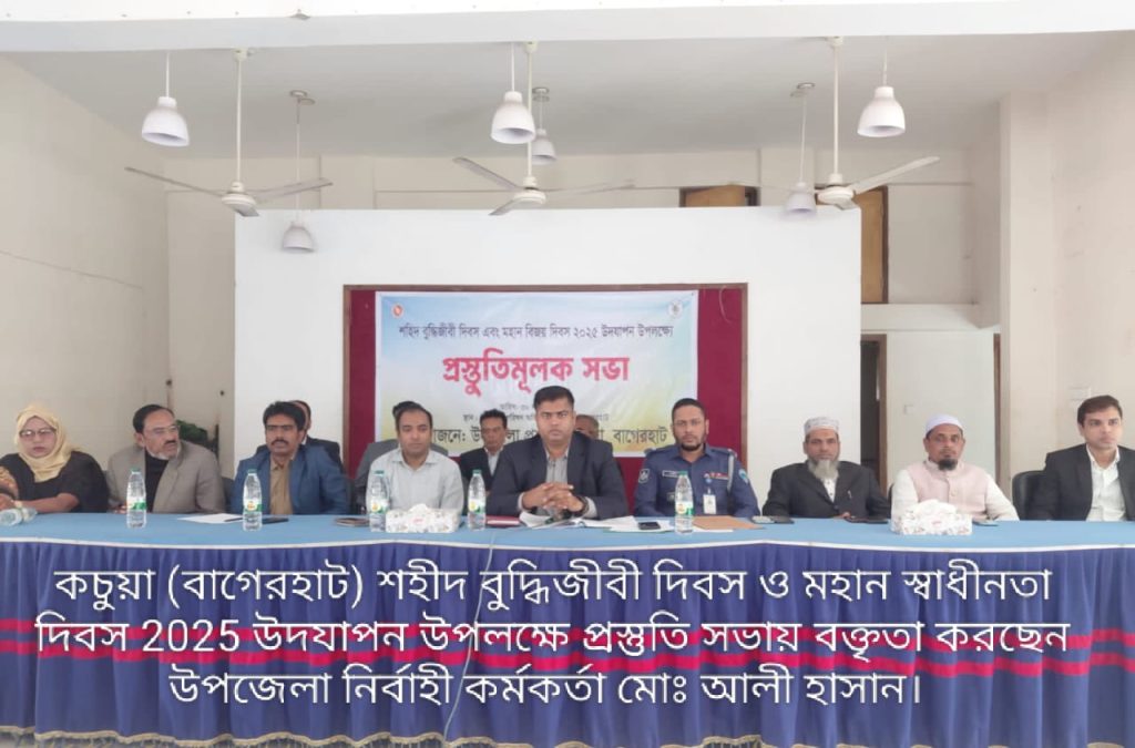 কচুয়া (বাগেরহাট) প্রতিনিধি।। কচুয়ায় ১৪ ডিসেম্বর শহীদ বুদ্ধিজীবী দিবস ও ১৬ই ডিসেম্বর মহান বিজয় দিবস ২০২৫ যথাযোগ্য মর্যাদায় উদযাপনের লক্ষ্যে এক প্রস্তুতি মূলক সভা অনুষ্ঠিত হয়েছে।