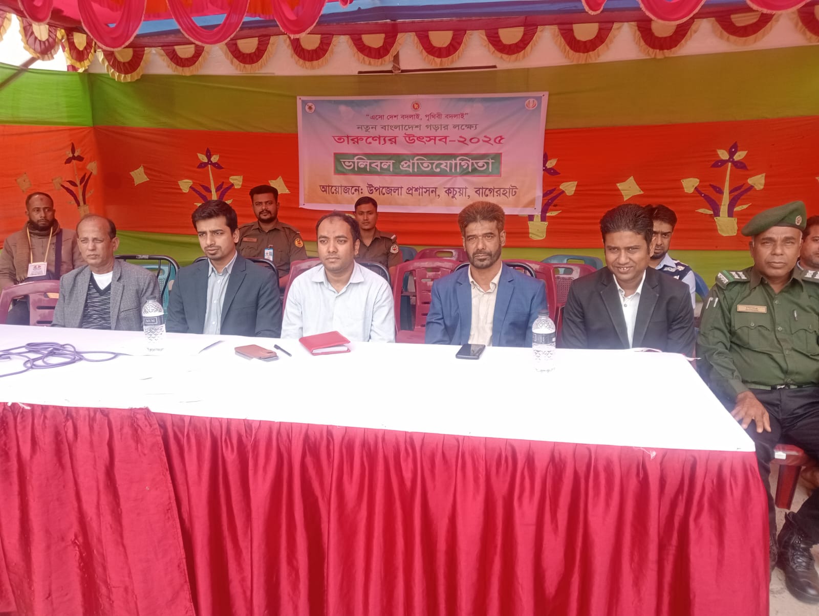 কচুয়া (বাগেরহাট) প্রতিনিধি।।কচুয়ায় নানা আয়োজনের মধ্য দিয়ে উদযাপিত হচ্ছে তারুণ্য উৎসব অনুষ্ঠান । এরই অংশ হিসেবে কচুয়া উপজেলা প্রশাসনের আয়োজনে দেশের বিভিন্ন স্থানের খেলোয়াড়দের সমন্বয়ে এক ৮ দলীয় ভলিবল টুর্নামেন্ট অনুষ্ঠিত হয়। এ উপলক্ষে আজ ২ নভেম্বর উপজেলা পরিষদের মাঠে এই ভলিবল টুর্নামেন্ট অনুষ্ঠিত হয়েছে।