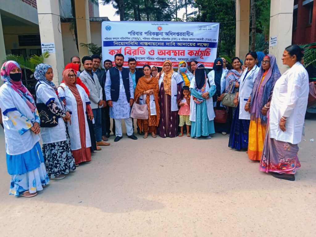 সুব্রত সরকার,মহম্মদপুর (মাগুরা) প্রতিনিধি।।কেন্দ্রীয় কর্মসূচির অংশ হিসেবে মাগুরার মহম্মদপুর উপজেলায় পরিবার পরিকল্পনা মাঠকর্মচারি সমিতির ব্যানারে পরিবার কল্যাণ পরিদর্শিকা (FWV),পরিবার পরিকল্পনা পরিদর্শক (FPI) ও পরিবার কল্যাণ সহকারী (FWA) দের প্রস্তাবিত নিয়োগবিধি দ্রুত বাস্তবায়নের দাবি আদায়ের লক্ষ্যে কর্মবিরতি ও অবস্থান কর্মসূচি পালিত হয়েছে ।