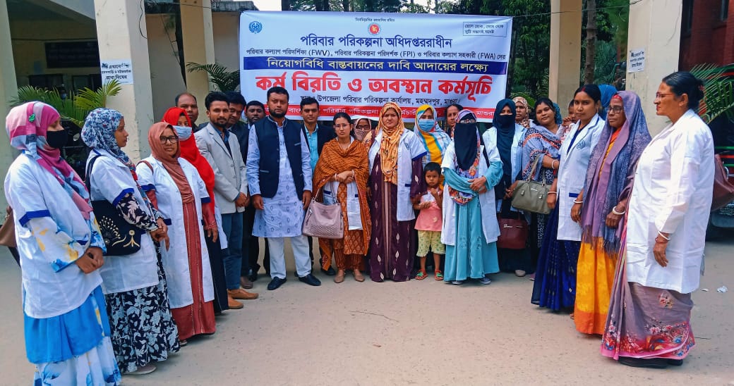 সুব্রত সরকার, মহম্মদপুর (মাগুরা)।। সারাদেশের কর্মসূচির অংশ হিসেবে মাগুরার মহম্মদপুর উপজেলায় পরিবার কল্যাণ পরিদর্শিকা (FWV),পরিবার পরিকল্পনা পরিদর্শক (FPI) ও পরিবার কল্যাণ সহকারী (FWA) দের প্রস্তাবিত নিয়োগবিধি দ্রুত বাস্তবায়নের দাবি আদায়ের লক্ষ্যে কর্মবিরতি ও অবস্থান কর্মসূচি পালিত হয়েছে ।