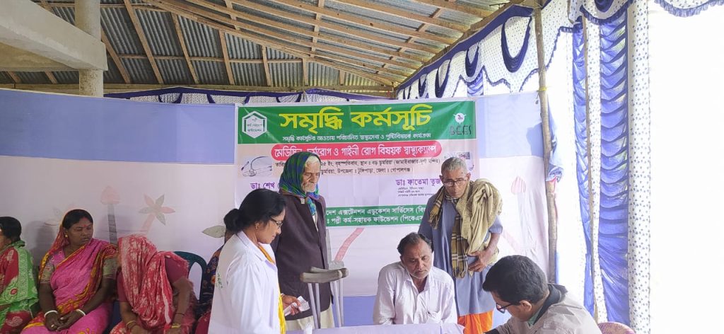 গোপালগঞ্জ প্রতিনিধিঃ গোপালগঞ্জের টুঙ্গিপাড়া উপজেলার জামাইবাজার দুর্গামন্দির প্রাঙ্গণে সমৃদ্ধি কর্মসূচির আওতায় বিনামূল্যে স্বাস্থ্যসেবা ও পুষ্টিবিষয়ক মেডিকেল ক্যাম্প অনুষ্ঠিত হয়েছে বৃহস্পতিবার, ০৪ ডিসেম্বর ২০২৫। সকাল ৯টা থেকে বিকাল ২টা পর্যন্ত চলা এই আয়োজনে নানা বয়সের শতাধিক নারী-পুরুষ ও শিশু চিকিৎসা নিতে উপস্থিত হন।