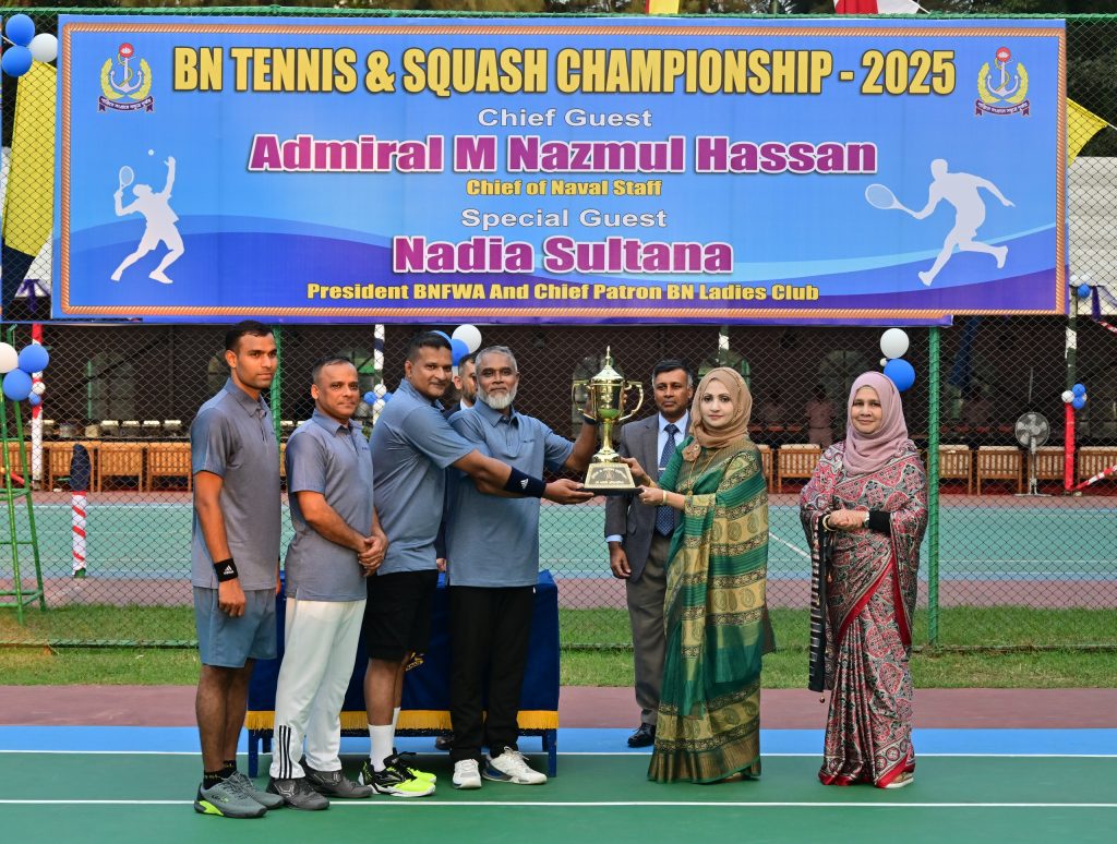 তেরখাদা প্রতিনিধিঃ বাংলাদেশ নৌবাহিনীর বাৎসরিক ‘টেনিস ও স্কোয়াশ প্রতিযোগিতা-২০২৫’ এর সমাপনী অনুষ্ঠান বুধবার (২৪ ডিসেম্বর ) চট্টগ্রামের ‘এরিয়া টেনিস এন্ড স্কোয়াশ কমপ্লেক্স’-এ অনুষ্ঠিত হয়েছে। প্রতিযোগিতার সমাপনী দিনে মাননীয় নৌবাহিনী প্রধান এডমিরাল এম নাজমুল হাসান প্রধান অতিথি এবং বাংলাদেশ নৌবাহিনী পরিবার কল্যাণ সংঘের প্রেসিডেন্ট নাদিয়া সুলতানা বিশেষ অতিথি হিসেবে উপস্থিত থেকে খেলা উপভোগ করেন এবং বিজয়ীদের হাতে পুরস্কার তুলে দেন।