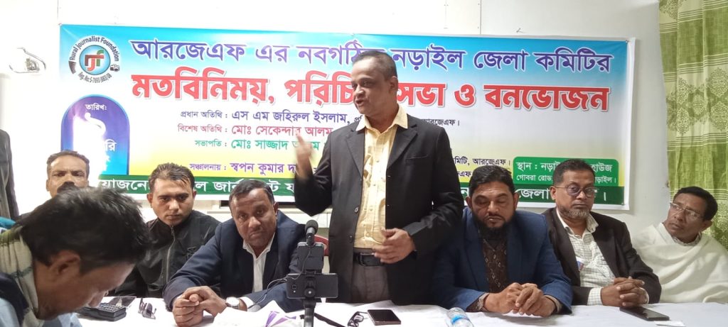 গত ৯ জানুয়ারী(শুক্রবার) নড়াইল জেলা শহরের ধোপাখোলা মোড় সংলগ্ন নড়াইল কফি হাউজে অনুষ্ঠিত উক্ত সভায় আরজেএফ’র সিনিয়র যুগ্ম মহাসচিব ও নড়াইল জেলা কমিটির নবনির্বাচিত সভাপতি সাজ্জাদ আলম খান সজলের সভাপতিত্বে ও সাধারণ সম্পাদক স্বপন কুমার দাসের সঞ্চালনায় এবং নির্বাহী সদস্য উজ্জ্বল খানের উপস্থাপনায় প্রধান অতিথি হিসেবে উপস্থিত ছিলেন আরজেএফ এর প্রতিষ্ঠাতা চেয়ারম্যান এস এম জহিরুল ইসলাম।