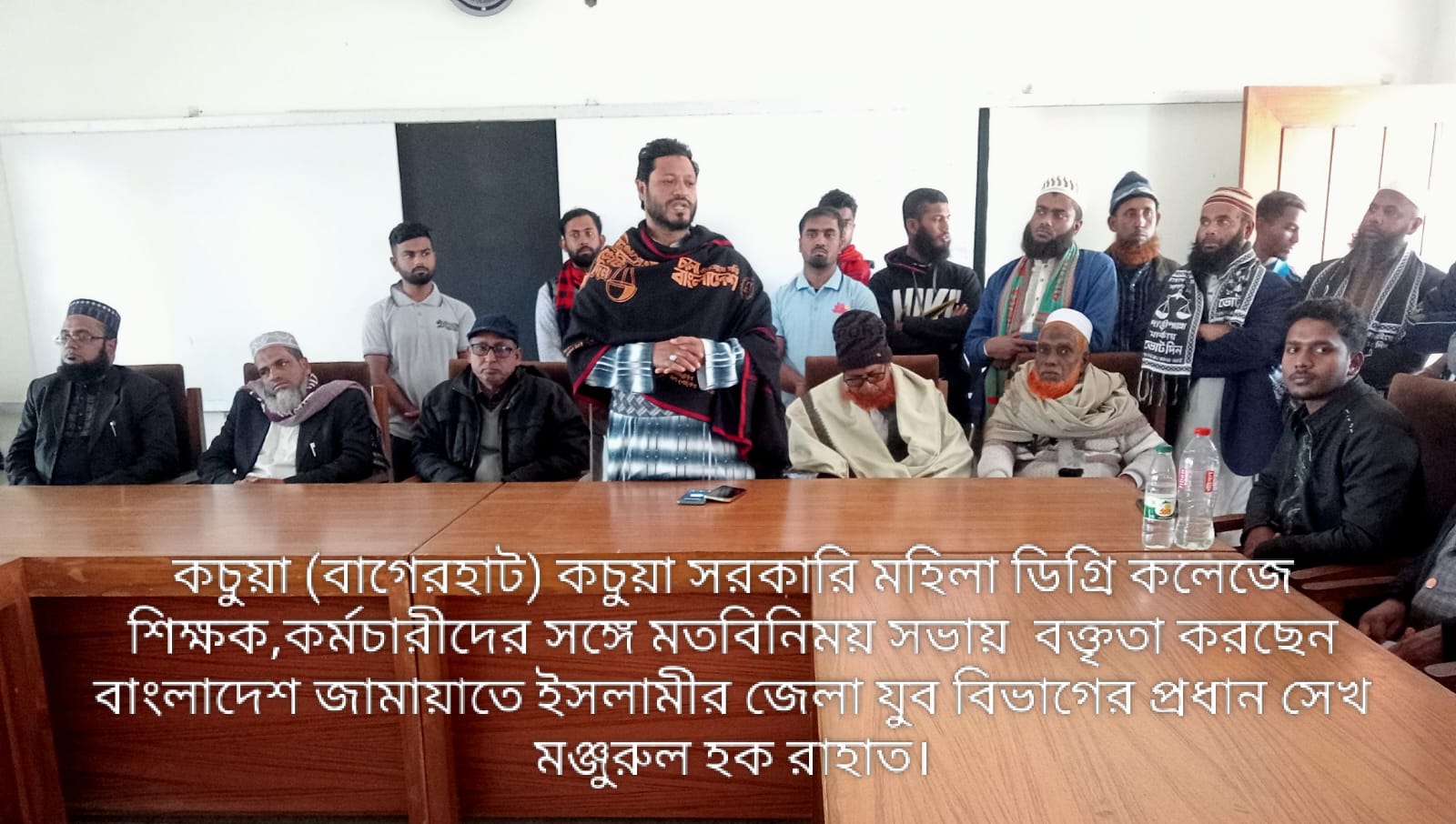 কচুয়া (বাগেরহাট) প্রতিনিধি।। কচুয়া সরকারি মহিলা ডিগ্রি কলেজের শিক্ষক,কর্মচারীর সঙ্গে মতবিনিময় সভা করলেন জেলা জায়ামাতে ইসলামের যুবনেতা জায়ামাত ইসলামের সংসদ সদস্য পদপ্রার্থী সেখ মনজুরুল হক রাহাত।এ সময় উপস্থিত ছিলেন কলেজের অধ্যক্ষ (ভারপ্রাপ্ত) প্রশান্ত কুমার রায়, সহকারী অধ্যাপক মিলন কান্তি মৈত্র,সহকারী অধ্যাপক অশোক কুমার রায়, প্রভাষক : হান্নান নকীব,প্রভাষক বিমল কান্তি বাড়ই,প্রভাষক অঞ্জন কুমার দাস, জেলা জামায়াতের ওলামা বিভাগের আমির অধ্যক্ষ মাওলানা আলতাব হোসেন, সাধারণ সম্পাদক শিক্ষক ফকির আমিনুল ইসলাম,উপজেলা আমির শিক্ষক মাওলানা রফিকুল ইসলাম, সদস্য সচিব মাওলানা শহিদুল ইসলাম, সুপার মাওলানা মোহাম্মদ আলী হোসেন সহ জেলা ও উপজেলার বিভিন্ন ইউনিয়নের নেতাও কর্ম বৃন্দ।